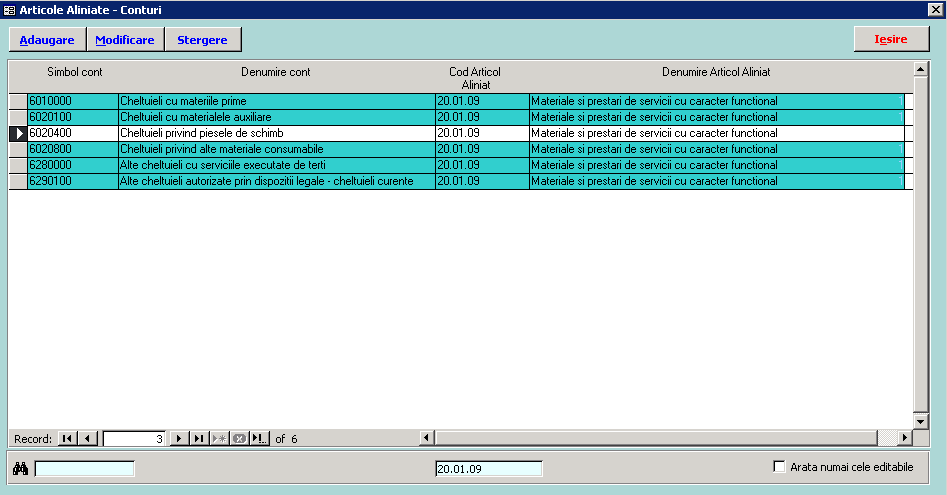 În fereastra principală vedem lista asocierilor de cont - articol-alineat existente. Înregistrările, conform Ordinului 2021 din 2013 - Anexa nr. 5, apar pe fond albastru și nu sunt editabile.