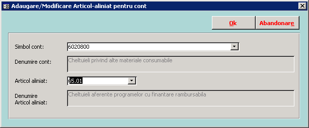 - Adăugare - Putem adăuga asocieri cont - articol alineat noi, inexistente în Ordinul 2021 din 2013. Alegem SimbolCont din lista derulantă; alegem Articol alineat din lista derulantă și cu butonul Ok salvăm înregistrarea.