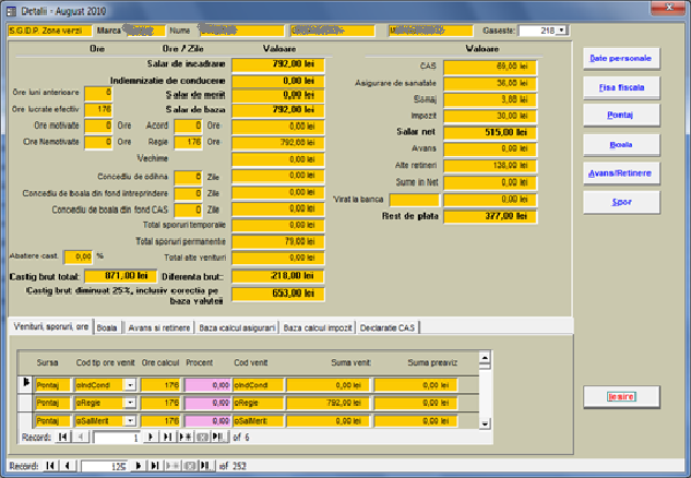 În partea inferioară a ferestrei găsim toate informațiile introduse legate de calcularea salariului lunar, cum sunt veniturile, orele suplimentare, avansurile, concediile medicale. Modificarea acestor date se poate realiza fie cu ajutorul butoanelor din partea dreaptă, fie prin accesarea acestora din meniurile corespunzătoare.