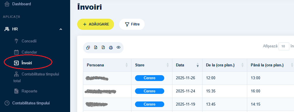 - Se va deschide lista cu cererile existente, împreună cu opțiunea de adăugare a unei noi învoiri.